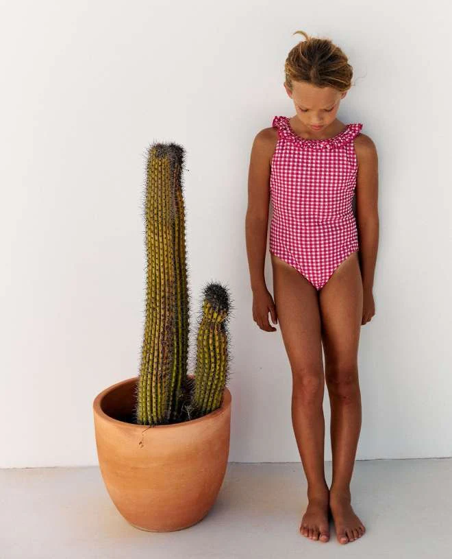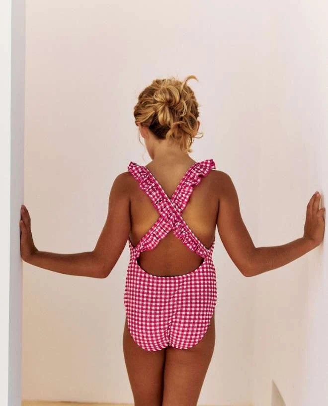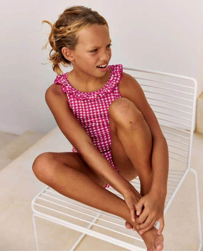 Une symphonie méditerranéenne émane de Fuschia Vichy, dans l’audace de ses carreaux et la grâce de son rose violacé.