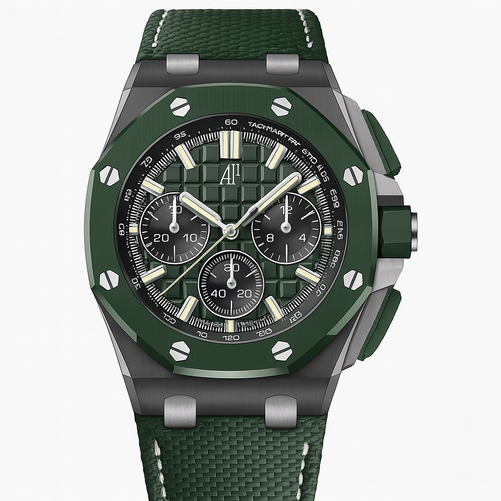 Son cadran vert kaki à motif “Méga Tapisserie”, emblématique de la collection Offshore, accueille trois compteurs noirs subtilement intégrés, apportant une lisibilité parfaite à ce chronographe automatique haute performance. Les aiguilles luminescentes et l’échelle tachymétrique noire assurent un affichage précis en toute situation.