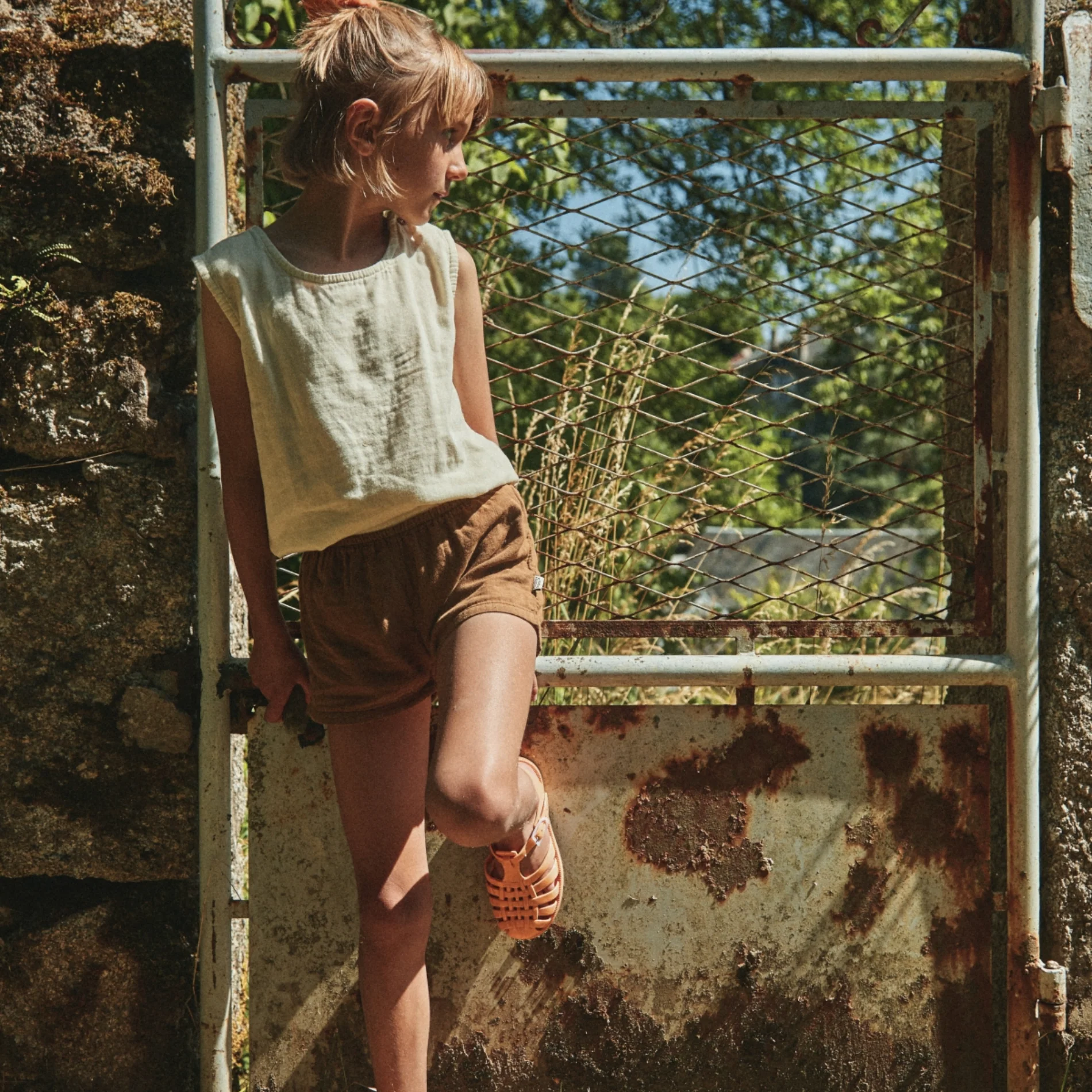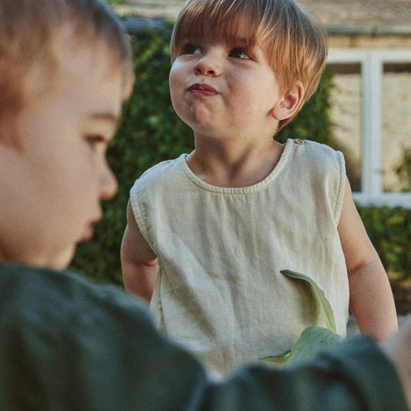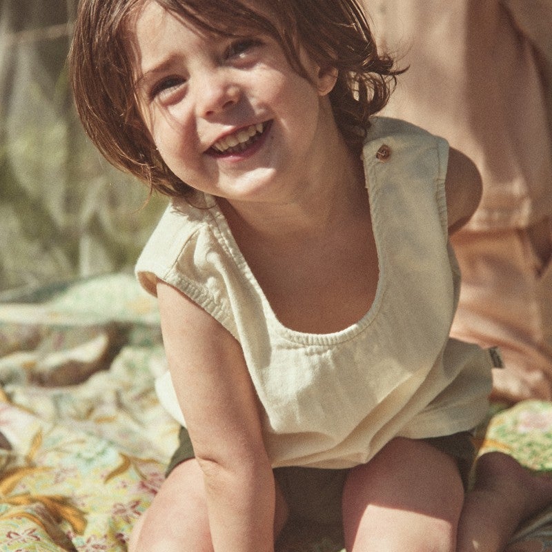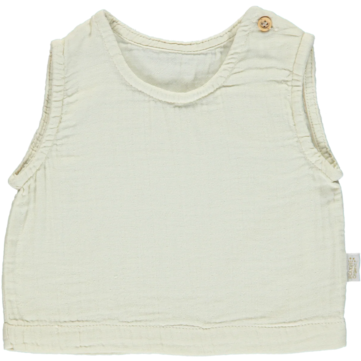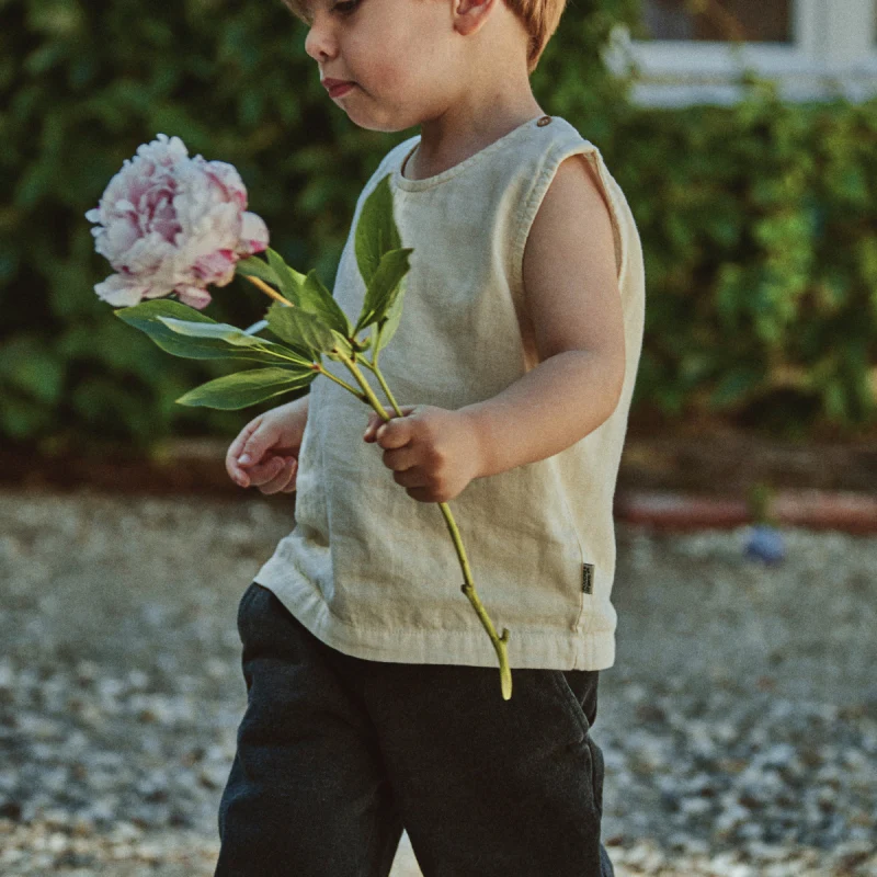 Débardeur Ceylan intemporel et mixte. Boutons aux épaules. 100% coton issu de l’agriculture biologique. Made in Portugal.