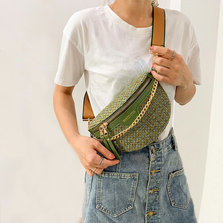 Ce sac banane tweed vert Garance est tout simplement magnifique. Vous aimerez ses détails en cuir et sa chaîne dorée qui donnent un look très chic à ce sac banane. Un Sac ceinture simple pensé pour être fonctionnel. Il se porte de différentes façons :