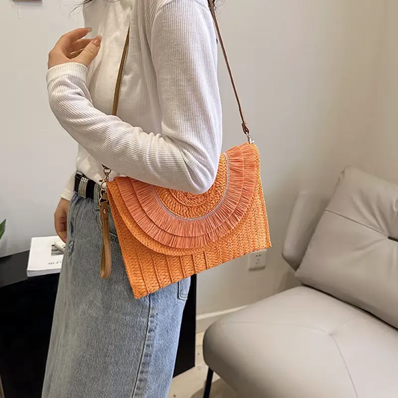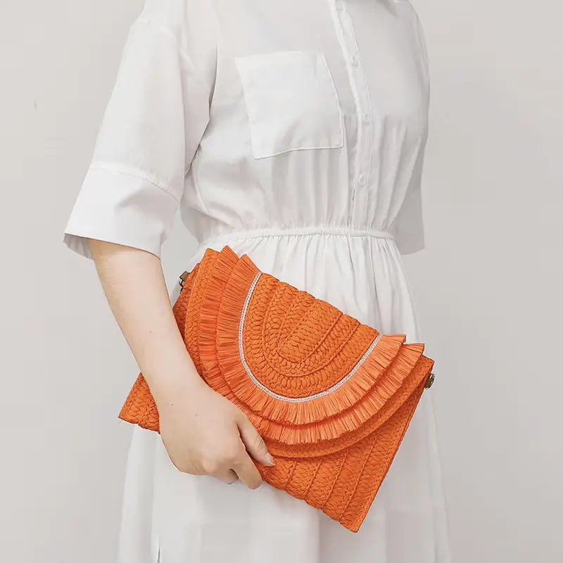 Sac Pochette Paille Franges Bohème Orange