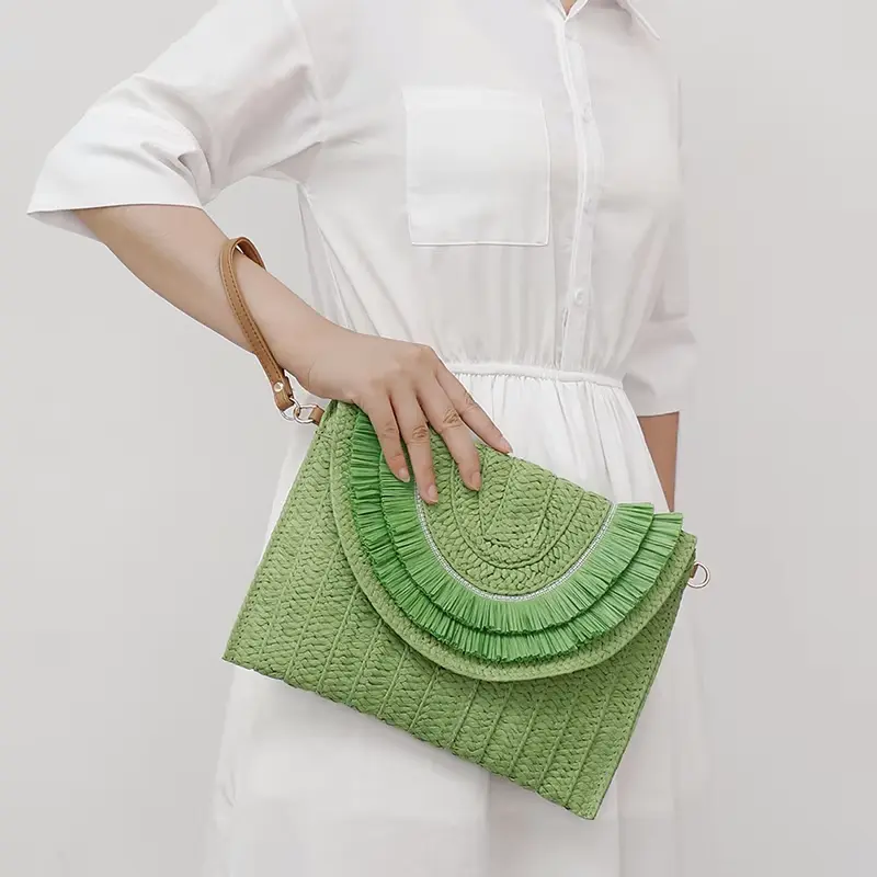 Sac Pochette Paille Franges Bohème Vert