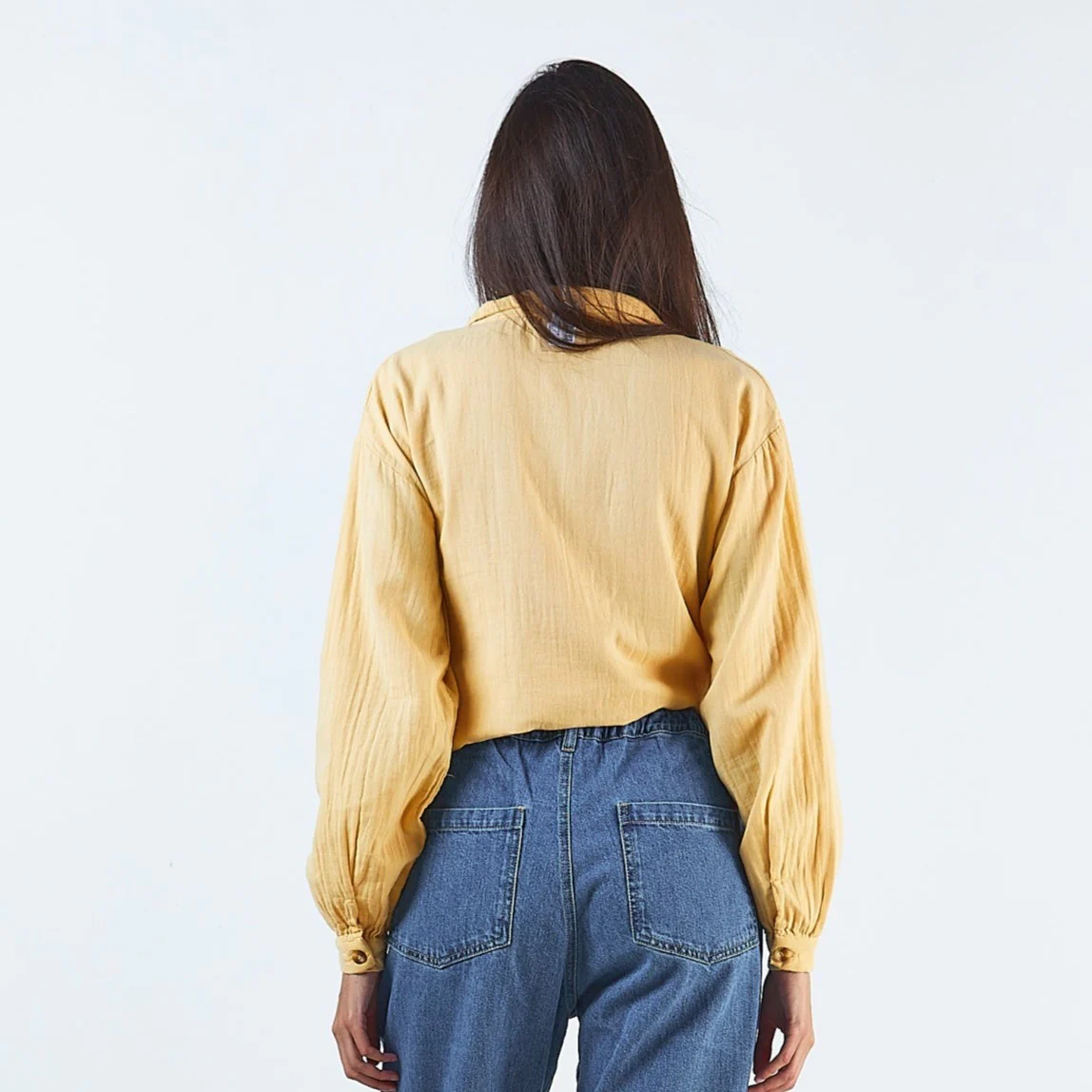 Chemise Marguerite. Col chemise avec deux rangées de boutons sur l’avant et sur les poignets. Se porte également ouverte en veste légère. 100% double gaze de coton issue de l’agriculture biologique. Made in Portugal.